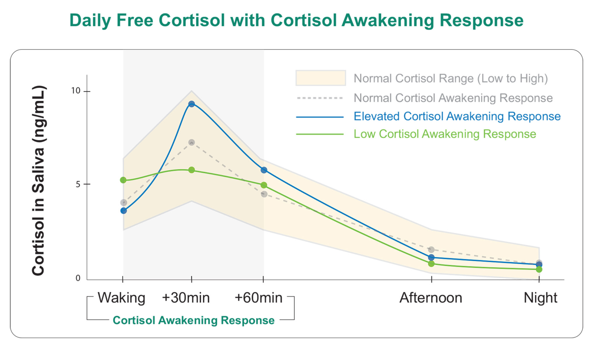 Even though a patient may have “normal” free cortisol levels throughout the day, that does not always mean everything is functioning properly. The graph below shows two good examples. A blunted or exaggerated CAR can appear even when single samples return “normal” results. The HPA axis might not be appropriately responding when faced with a stressor, even when cortisol levels are fluctuating nicely throughout the day.