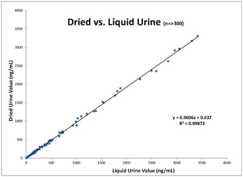 Dried samples are accurate for hormone testing, and values correlate to liquid samples (see graph, below).